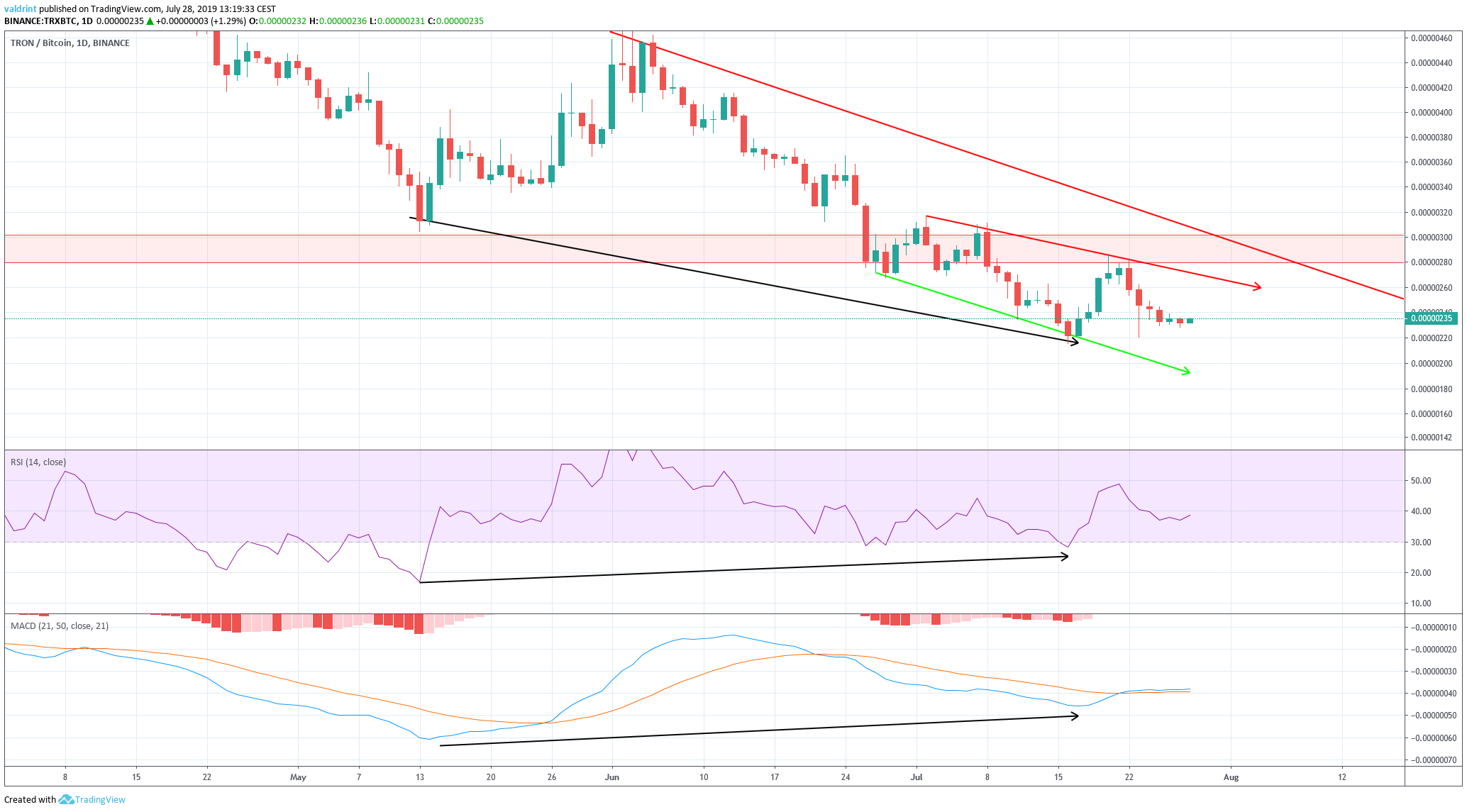 A look at the daily time-frame shows that the TRX price has been following a descending resistance line since the beginning of January 2019.