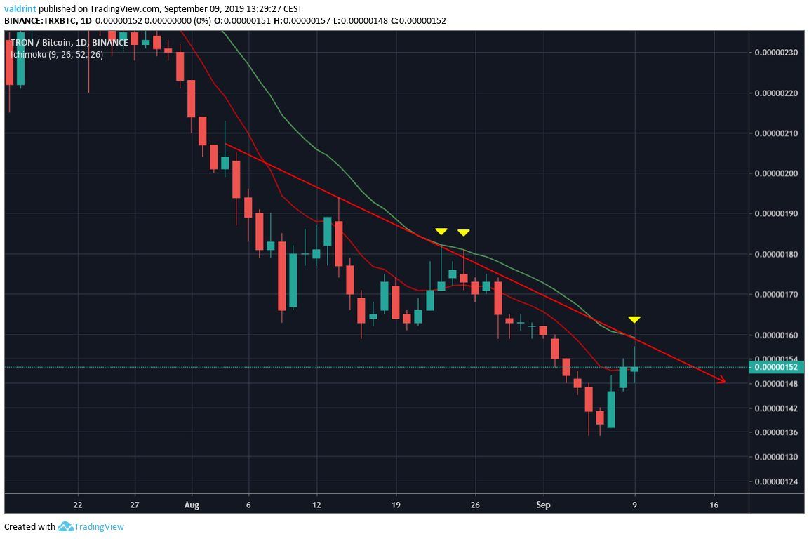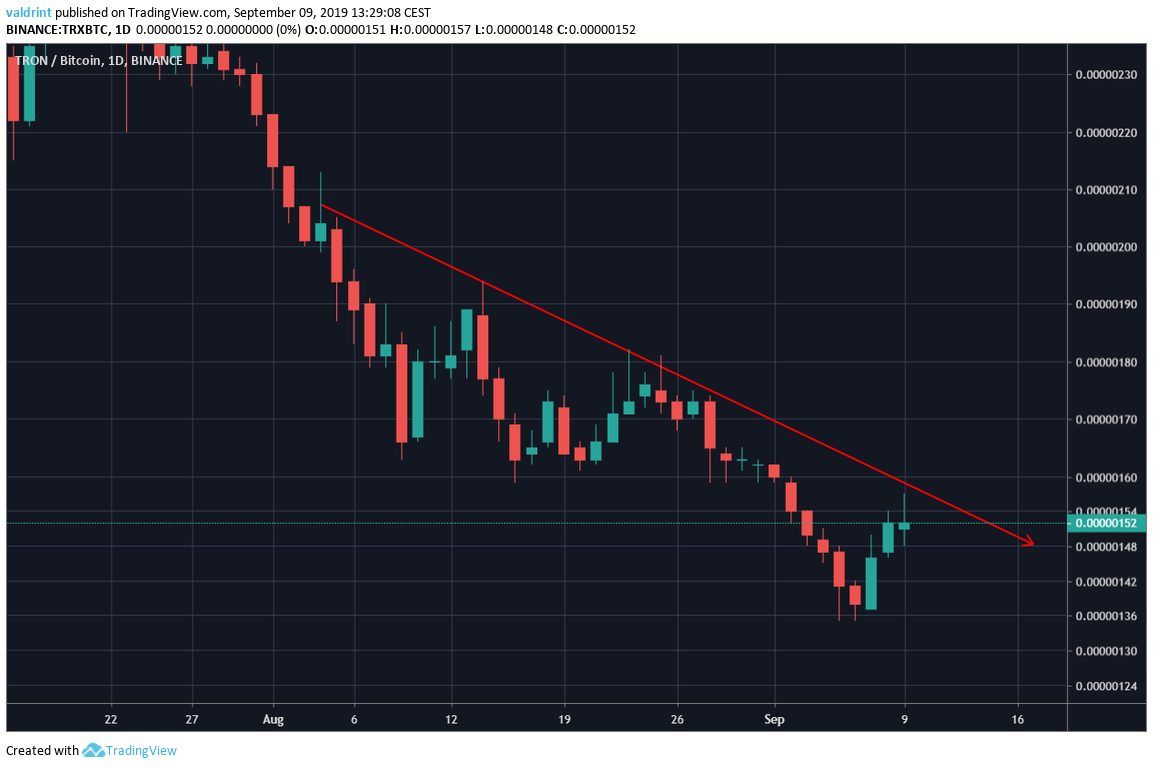 On September 6, 2019, the TRX price reached a low of 135 satoshis. An upward move began and TRX reached a high of 154 satoshis on September 8. After a brief decrease, it reached a higher high of 156 satoshis the next day.