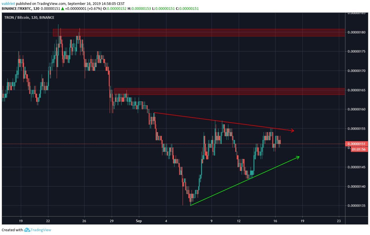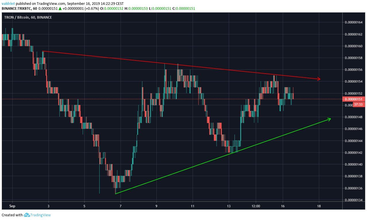 On September 7, 2019, the TRX price reached a low of 135 satoshis. An upward move followed, culminating with a high of 156 satoshis reached on September 10. The price has been decreasing since.