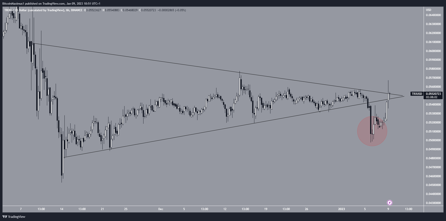 The technical analysis from the six-hour time frame is leaning toward a successful breakout. The main reason for this is that on Jan. 5, the TRX price seemingly broke down from a symmetrical triangle (red circle). However, it reclaimed the triangle’s support line during the next 24 hours and is now attempting to break out.