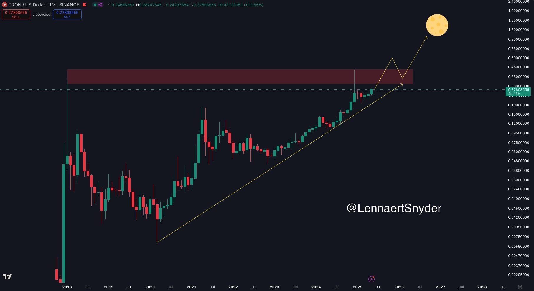 Analyst Lennaert Snyder recently shared an optimistic outlook for TRX on the social media platform X, pointing to a technical pattern that suggests significant upside potential.