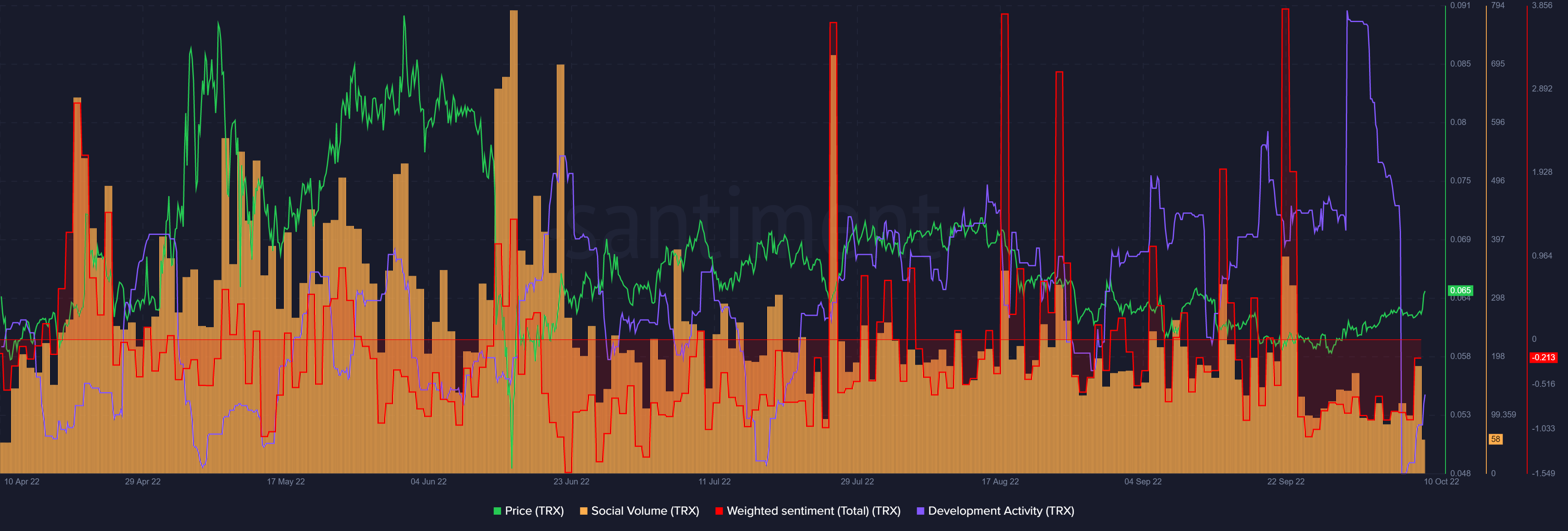 Looking at TRX on-chain metrics, it was evident that development activity had fallen to all-time low levels alongside weak weighted social sentiment despite the Justin Sun Huobi buyout news.Â