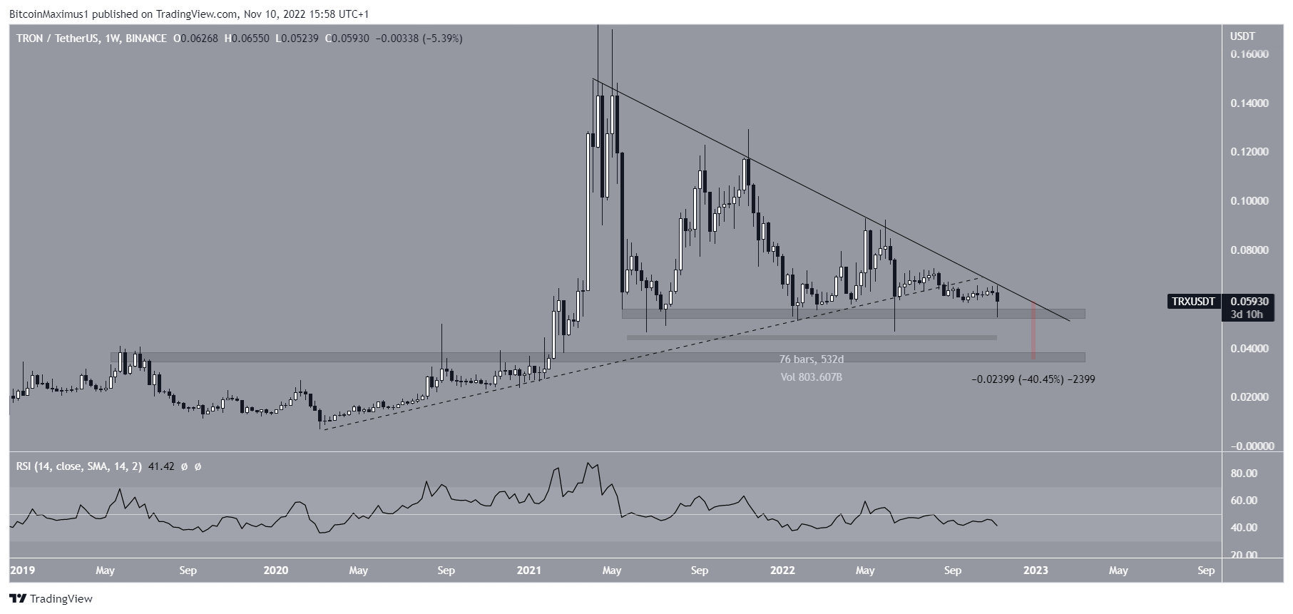 The Tron (TRX) price risks breaking down from a long-term horizontal support area. If it occurs, this could trigger a 40% drop.
