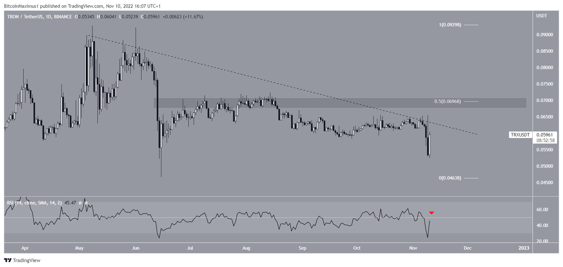 The technical analysis from the daily time frame supports the possibility of a breakdown. Firstly, it shows that the Tron price has followed a descending resistance line since May. The line rejected the price on Nov. 7 and initiated the ongoing downward movement.
