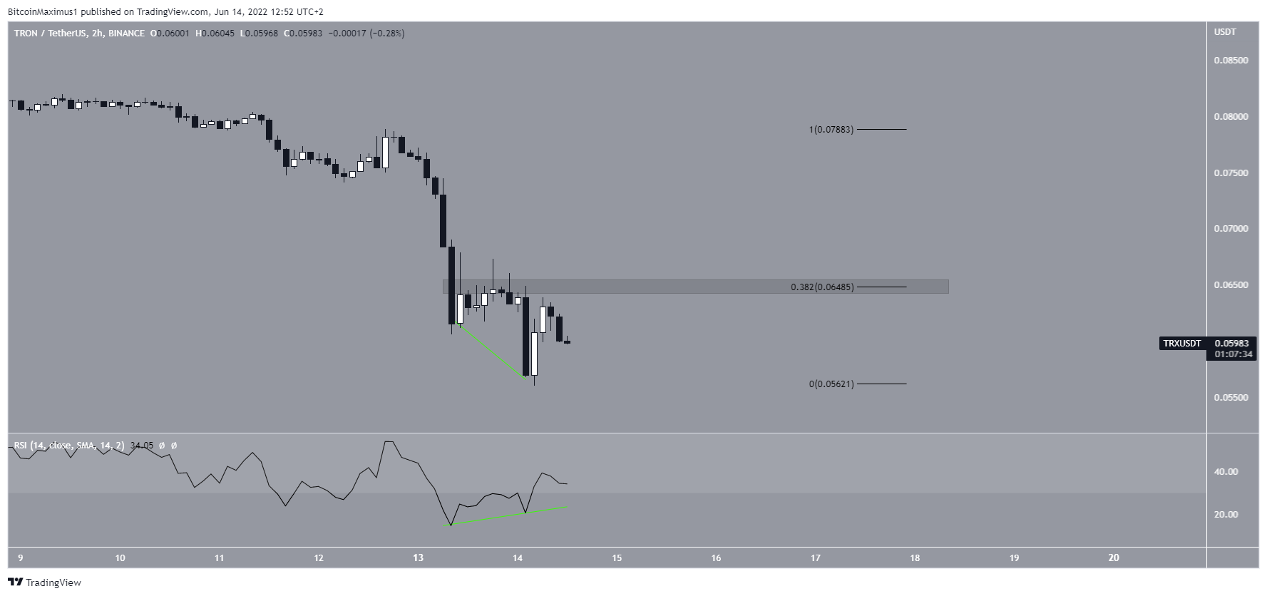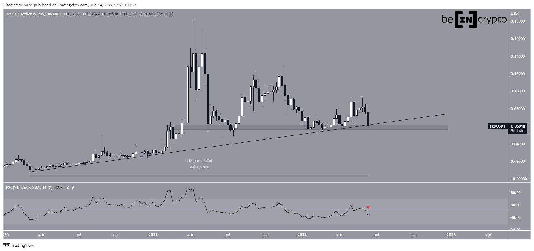 Similarly to the weekly, the daily time frame provides a bearish outlook. It shows that TRX has broken out from an ascending parallel channel. Such channels usually contain corrective movements, meaning that a breakdown from them is expected.Â