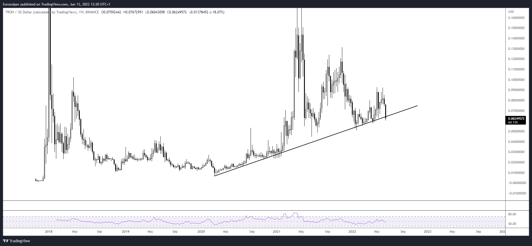 Cryptocurrency trader @TheEuroSniper tweeted a chart of TRX which shows a potential long-term ascending support line breaking. The line coincides with that which is outlined above.