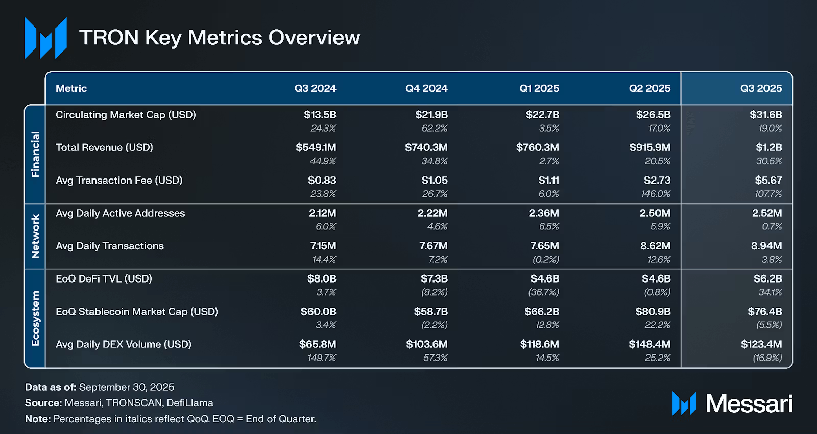 According to Messari’s report, by the end of Q3 2025, Tron’s (TRX) market capitalization had increased by 19% quarter-over-quarter to $31.6 billion. Meanwhile, network revenue surged 30.5% to $1.2 billion, marking new all-time highs.