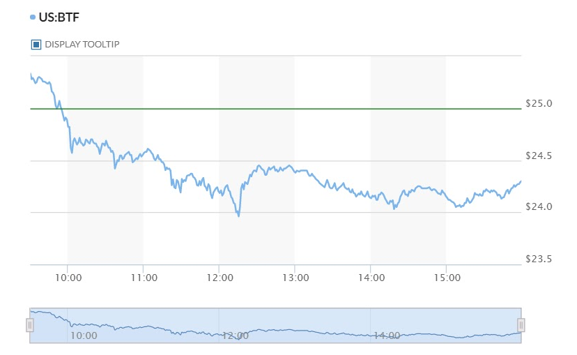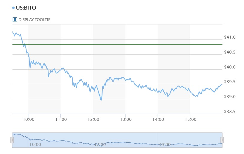 ProShare’s BITO ETF appreciated 3.19% on its first day, but its value has dropped by -6.51% overall, opening at $41.94 and currently standing at $39.21. Over the past 24 hours alone, BITO has declined -3.23%. Valkyries ‘BTF’ opened yesterday at $25. Its value rose slightly upon opening, however it has since fallen continuously, currently valued at $24.3. This is a 24-hour difference of -2.80%.