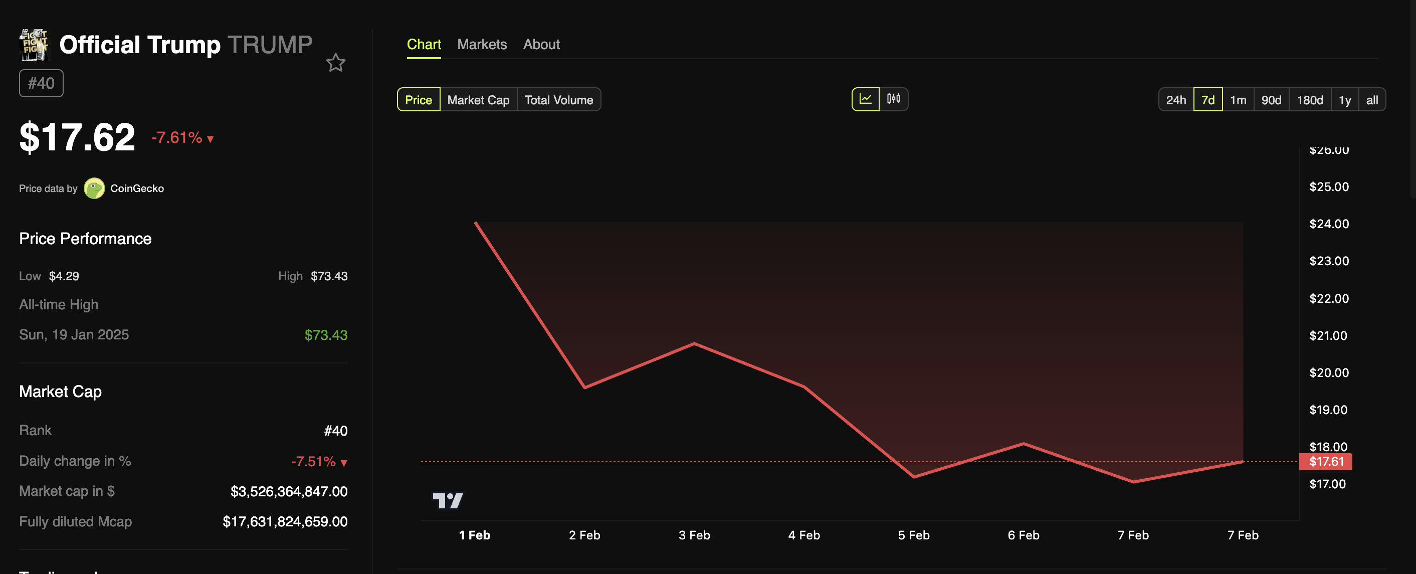 While TMTG is expanding its financial footprint, Trump’s other financial venture has faced challenges. The Official Trump (TRUMP) meme coin, in particular, has struggled in the market after its initial hype faded.