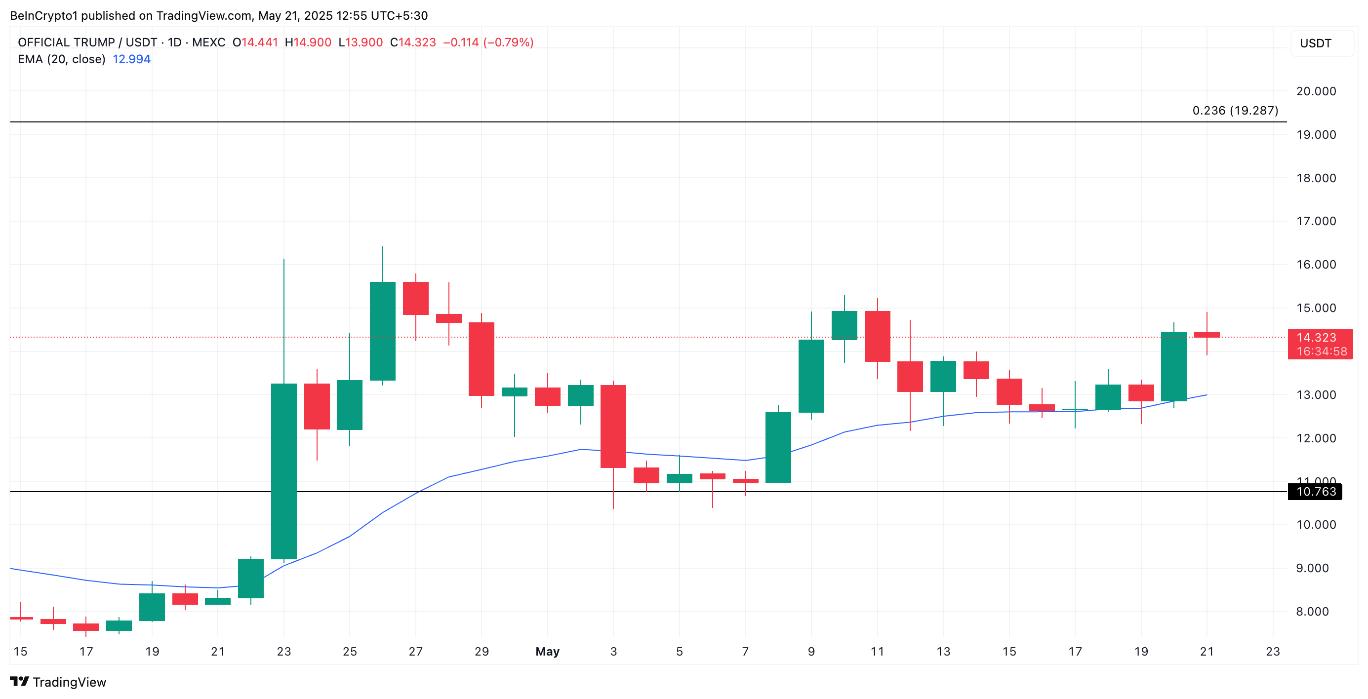 Technical indicators further support the positive sentiment around TRUMP. For example, on the daily chart, the meme coin has bounced off the dynamic support offered by its 20-day Exponential Moving Average (EMA) at $12.99