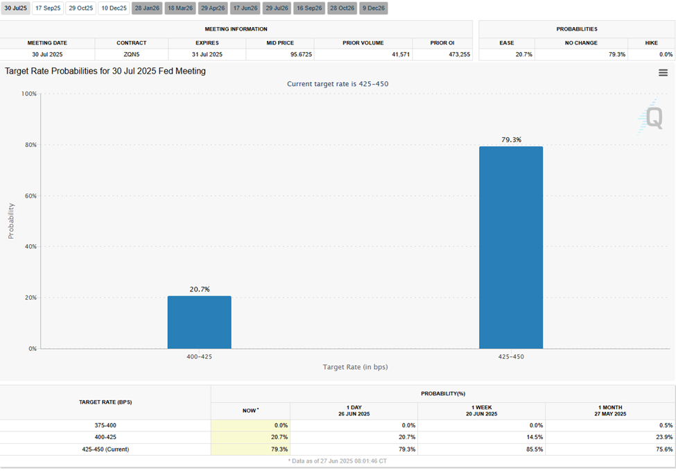 Based on the CME FedWatch Tool, there is a 79.3% probability of the Fed keeping interest rates unchanged in the July 30 meeting.