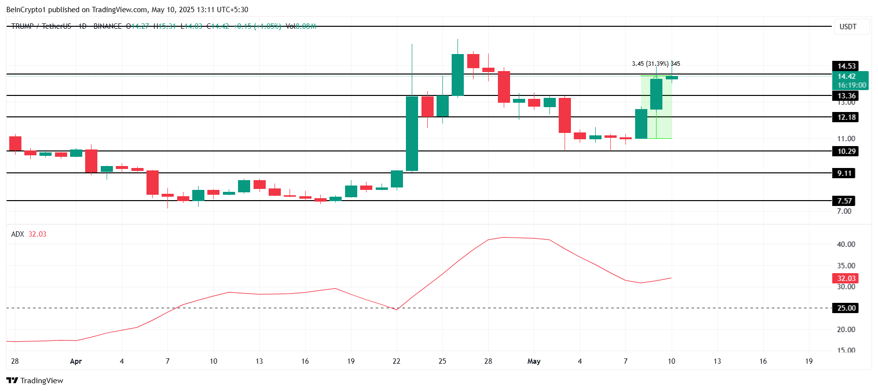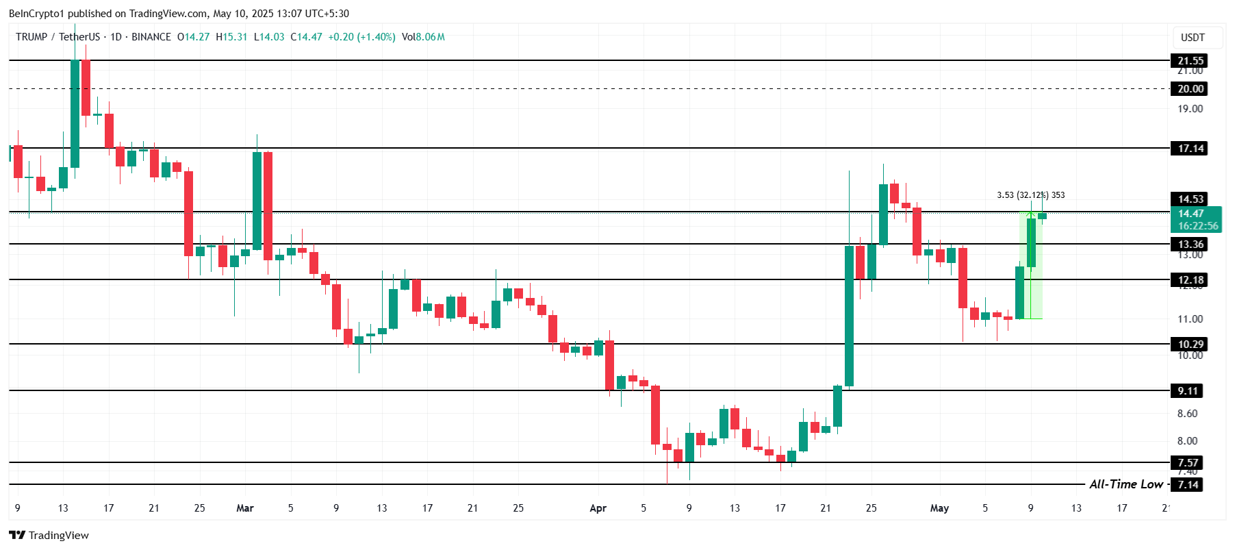 TRUMP is currently trading at $14.47, showing a 15% price increase over the past week. The altcoin is approaching the critical resistance level of $14.53, with the next target being $17.14.