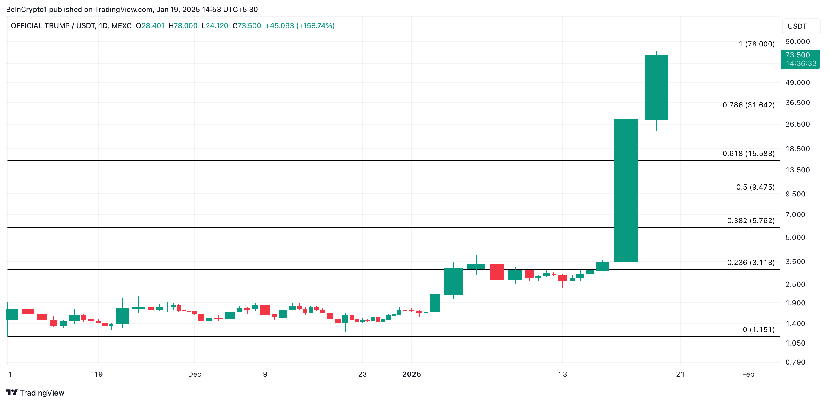 At 98.88, TRUMP’s RSI indicates that the meme coin is extremely overbought, suggesting unusually high buying pressure. This signals a potential reversal or correction as the price may struggle to sustain its current trajectory.