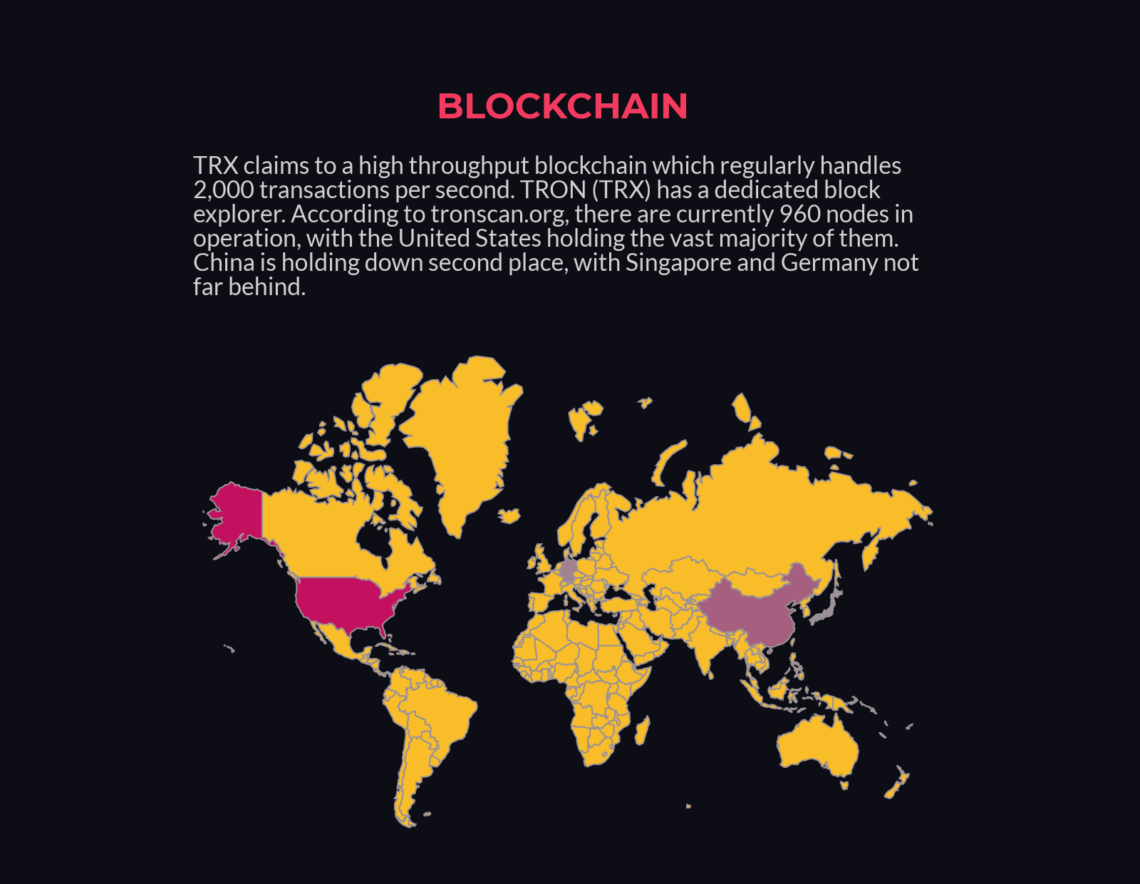 According to tronscan.org, there are currently 960 nodes in operation, with the United States holding the vast majority of them. China is holding down second place, with Singapore and Germany not far behind.