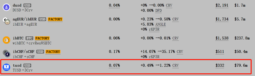 The relationship between TUSD and Curve is long-standing. In the Ethereum ecosystem, the TVL in the TUSD-3CRV pool amounted to $80 million, higher than that of most other pools.