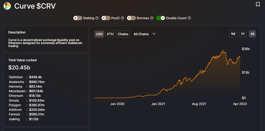 SponsoredAs an automated market maker in DeFi that offers stablecoin swap services, Curve’s total value locked (TVL) has hit $20.45B, ranking first among all decentralized exchanges (DEXs).