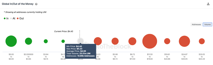 According to IntoTheBlock’s Global In/Out of The Money Around Price (GIOM) data, 19,860 investors that bought 25.51 million UNI at the average price of $4.95 could cause a pullback.