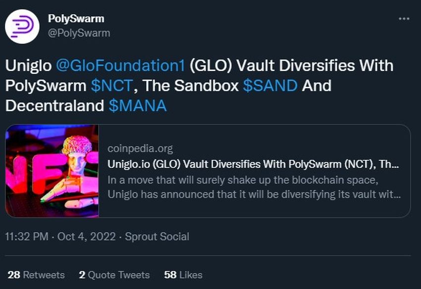 In a recent tweet, PolySwarm shared a news article and directly mentioned Uniglo.io and how it diversified its asset-backed token GLO with PolySwarm.