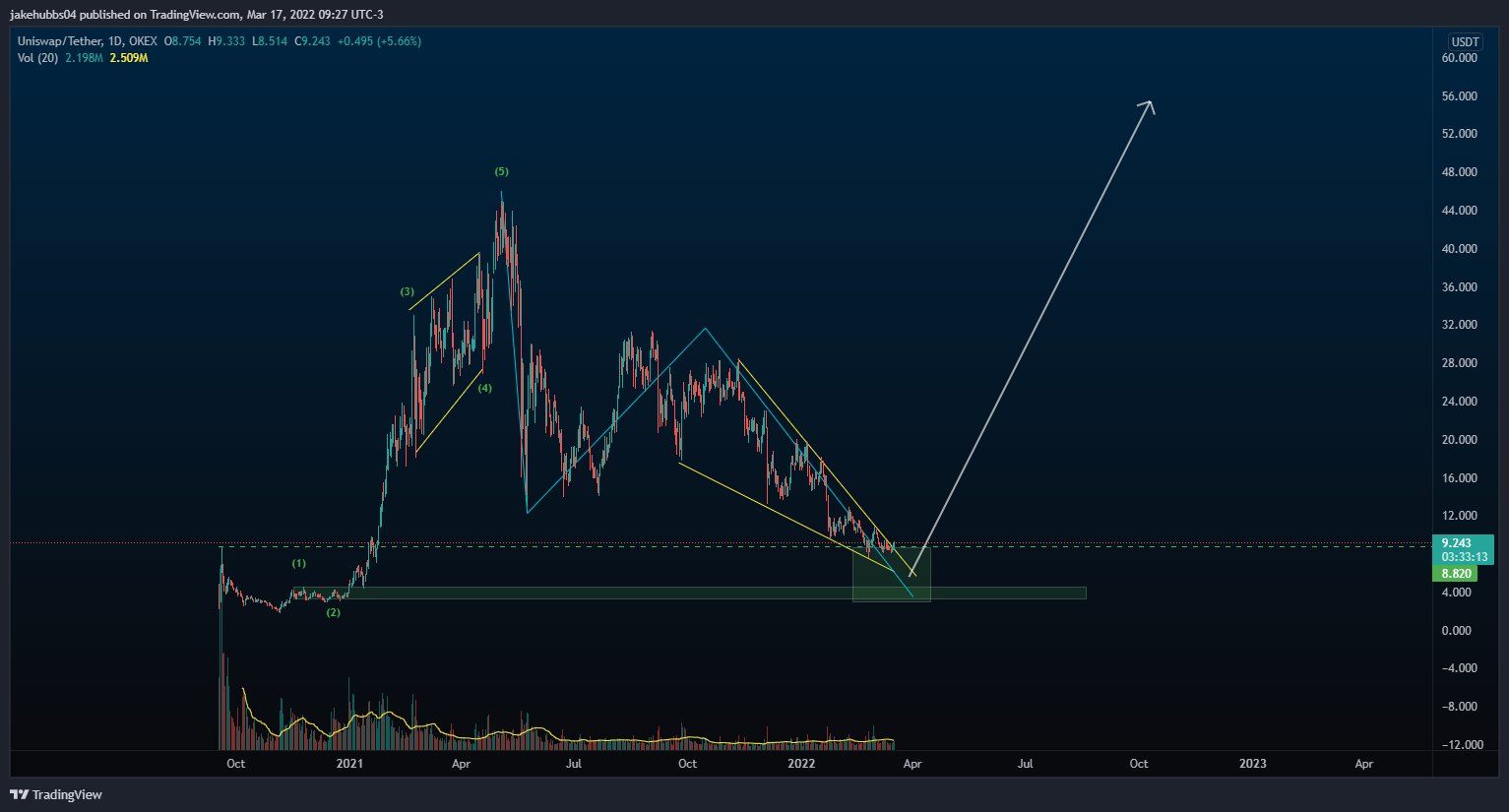 Uniswap (UNI) has been moving upwards since Feb 24 and is approaching the end of a bullish pattern.