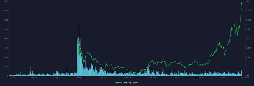 A closer look at the social volume metric for UNI explains the increasing engagements which began on Sunday. The volume, which sits at 62 points, corresponds with the recent upswing in the UNI price to $13 before retracing slightly.