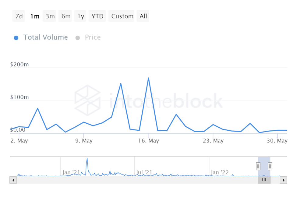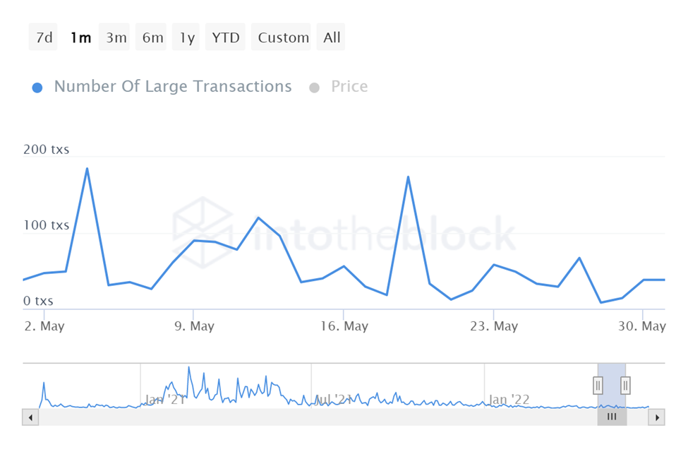 In May, the number of large transactions involving UNI reached a peak of 185,000 at a price of $7.56 on May 4.