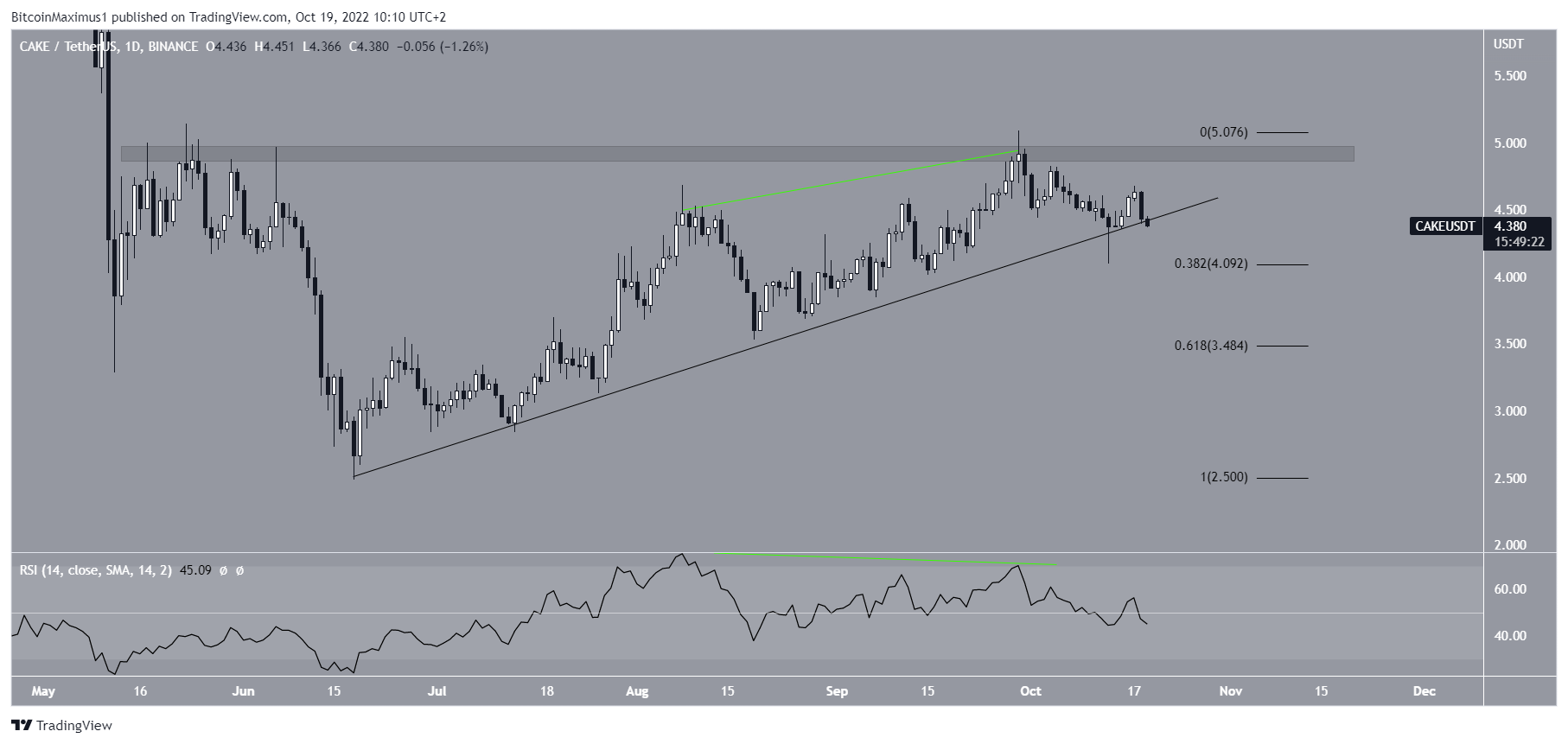 The CAKE price has been falling since Sept. 29 after being rejected at the $4.90 horizontal resistance area. The decrease also confirmed a bearish divergence in the daily RSI, which is now below 50, further adding to the bearish sentiment.