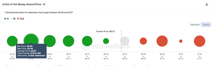 Still, the bulls could push the rally toward $8 if the investors decide to hold out for more gains. But UNI will have a hard time breaking above the $7 resistance. As seen above, 5,000 wallets that bought 13.5 million Uniswap tokens at the maximum price of $7.10 could slow the rally.