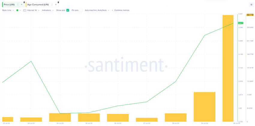 As depicted in the chart below, UNI Age Consumed increased astronomically from 11.66 million on July 22 to 292.71 million at the close of July 30.