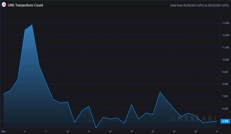 The total transaction counts on Ethereum as of May 31, 2021, was approximately 45 million. This resulted positively in one of the chain’s top-performing decentralized applications, Uniswap. The DEX recorded around $84.72 billion in May 2021.
