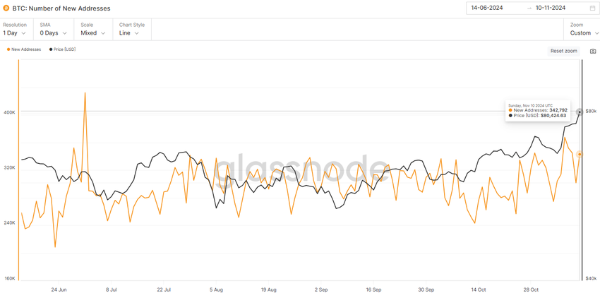 Sponsored SponsoredThe Glassnode data on both active and new Bitcoin addresses shows spikes in activity as the price climbs. On November 10, 2024, when Bitcoin reached around $80K, active addresses totaled approximately 790,937, and new addresses were at 342,792, reflecting a significant surge in network participation. This pattern aligns with previous peaks, such as on November 6, when active addresses reached 895,171 and new addresses hit 367,468, at a price of around $75K. Another similar instance occurred on July 1, with active addresses peaking at 897,630 and new addresses at 432,026, when Bitcoin was hovering around the level of $62K.