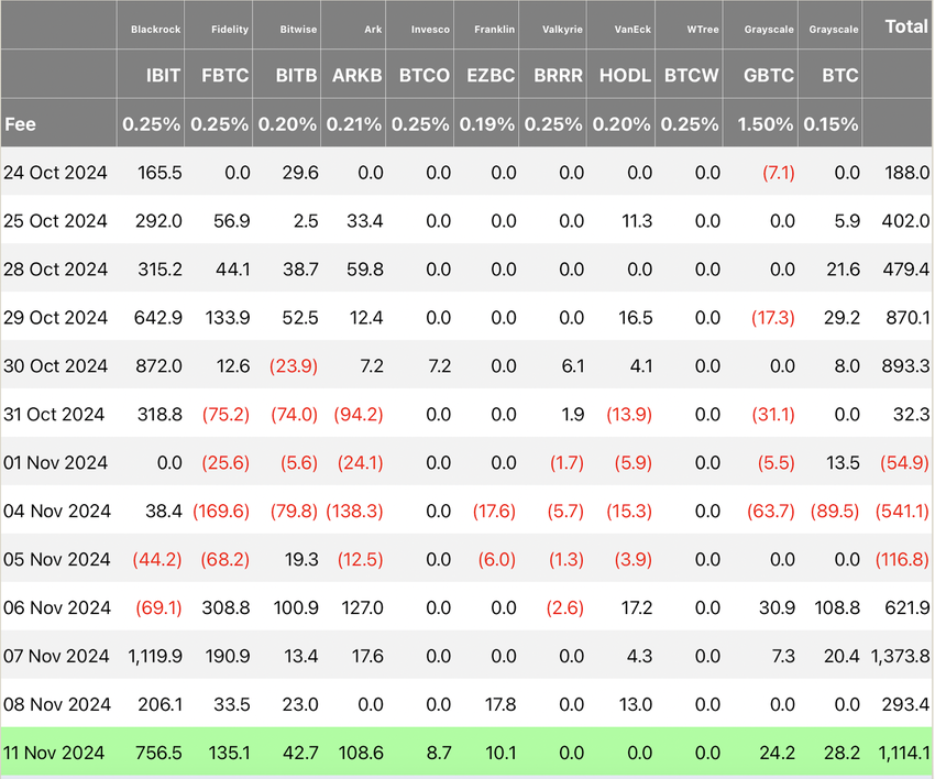 Post-election Bitcoin ETF flows show a significant net inflow, totaling approximately $3.40 billion from November 6 to November 11, according to Farside Investors data. During this period, no notable outflows were recorded, indicating that institutional investors appear to be banking on the possibility of favorable regulations and showing increasing confidence in Bitcoin immediately following the election.
