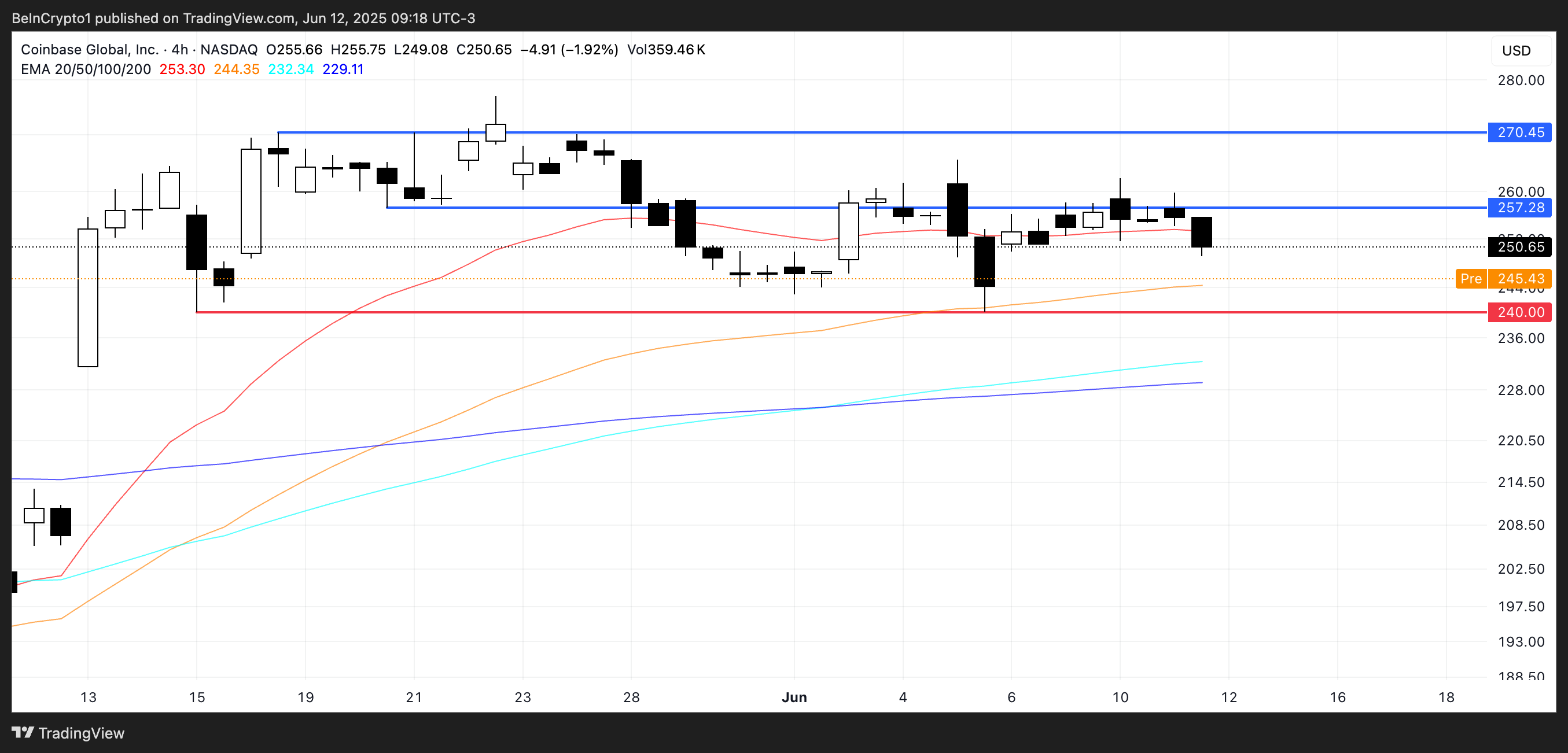 If it manages to hold that support and reclaim resistance at $257, an uptrend could take COIN back toward the $270 level. However, failure to hold above $240 could trigger additional downside pressure in the short term.