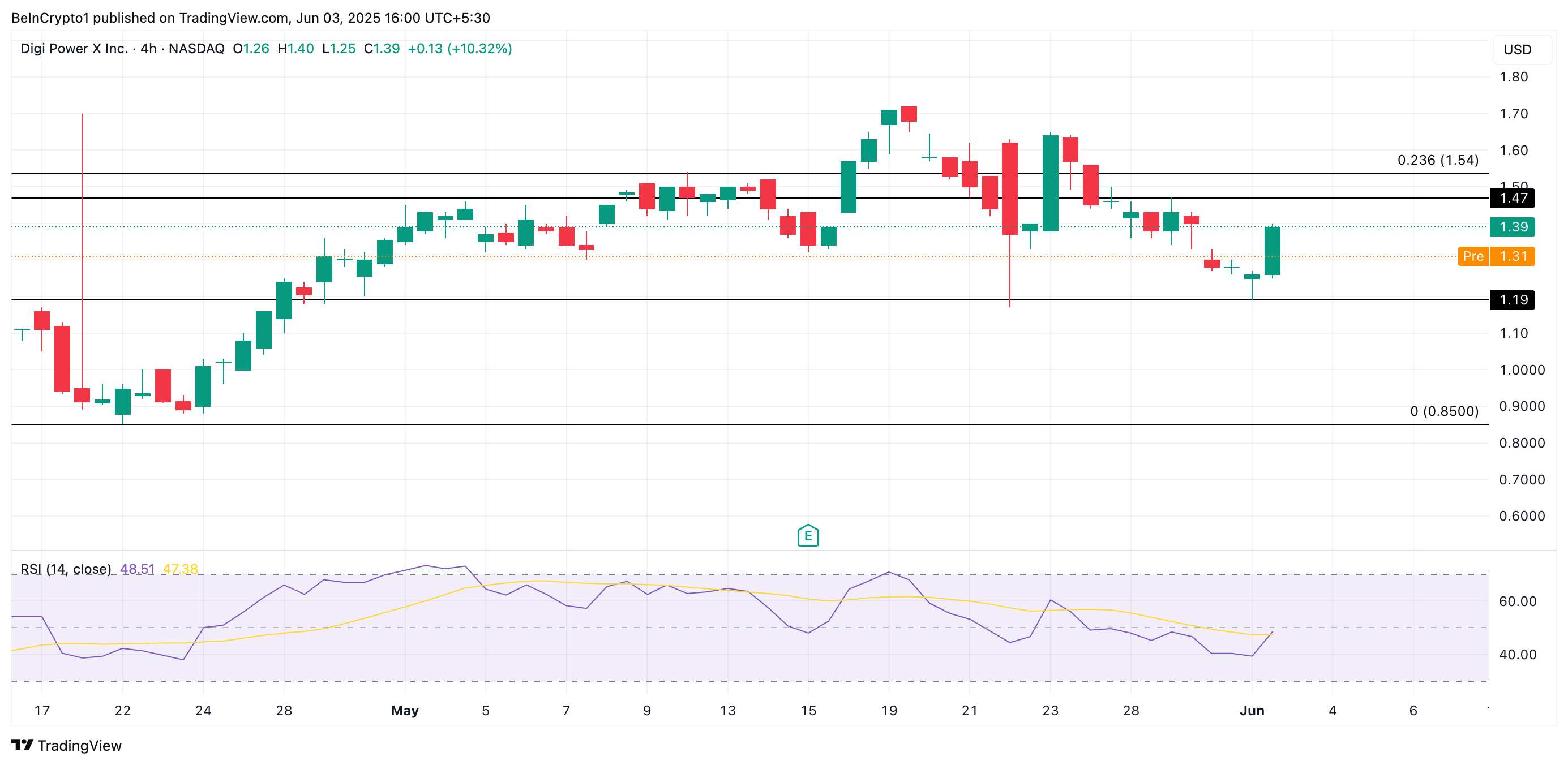 Currently hovering near $1.31 during the pre-market session, the stock’s value is up 10% over the past day. Readings from its four-hour chart show its Relative Strength Index (RSI) poised to break above the neutral-50 line, indicating a resurgence in new demand for the stock. As of this writing, DGXX’s RSI is at 48.51.