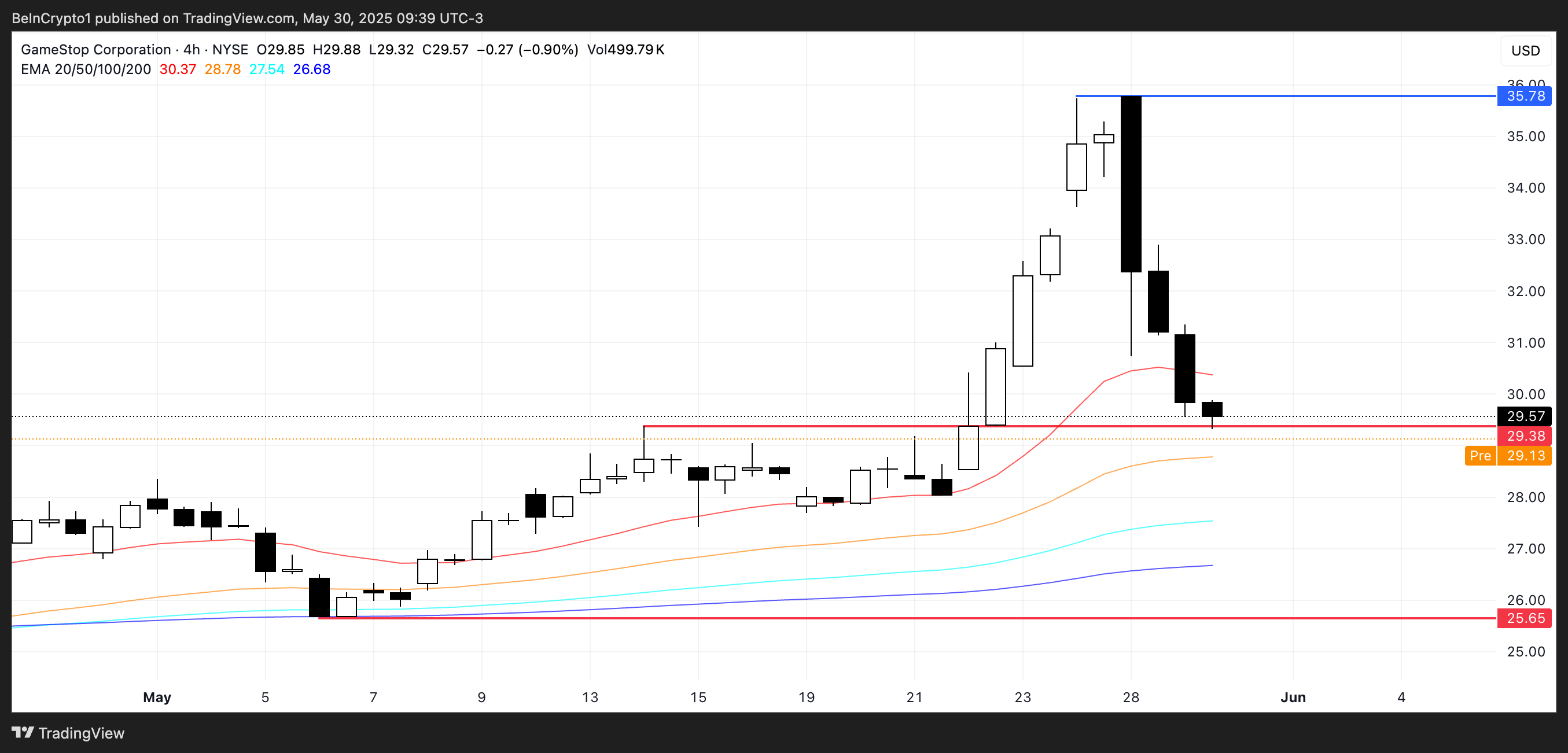Technically, GME is under pressure and currently testing key support at $29.38. If this level fails to hold, the next downside target sits near $25.65, suggesting more pain could follow if bearish momentum continues.
