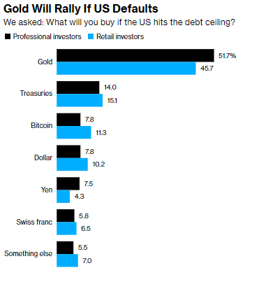 Bloomberg analysts write that a U.S. default will provoke a flow of assets into gold, U.S. Treasury bonds, and Bitcoin. As polls have shown, professional investors prefer precious metals.