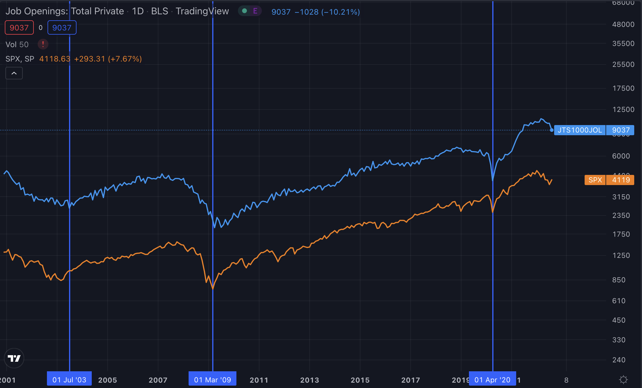 Historically, the decrease in new job openings has largely correlated to the price of the S&P 500. It can be seen from the charts that the S&P 500 and job openings bottomed at nearly the same period during 2003, 2009, and recent 2020 bear markets.
