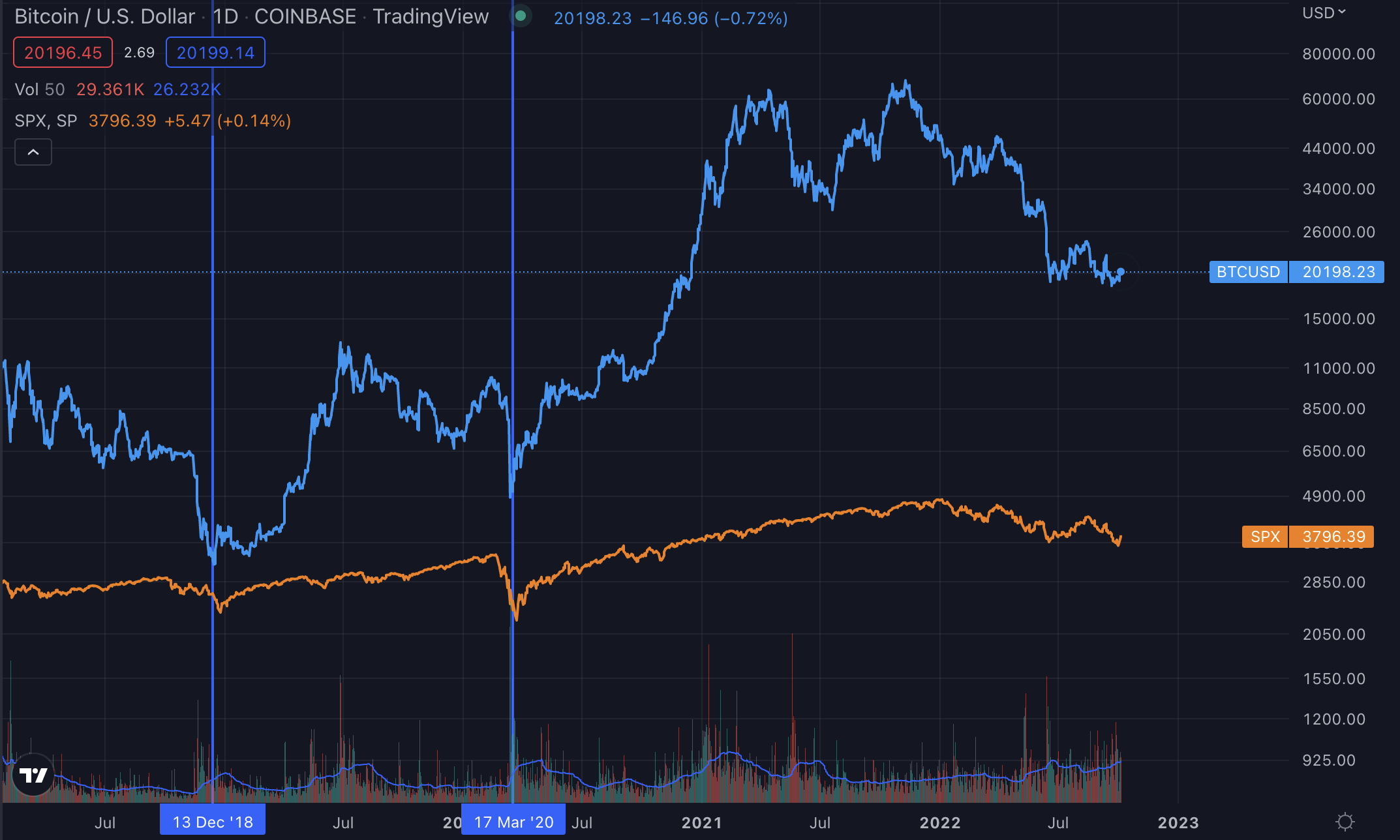 The price of Bitcoin hugely correlates with the S&P 500. As seen in the charts, both SPX and BTC bottomed at nearly the same time in December 2018 and March 2020. Further, they topped the 2021 bull rally at almost the same time in late 2021.