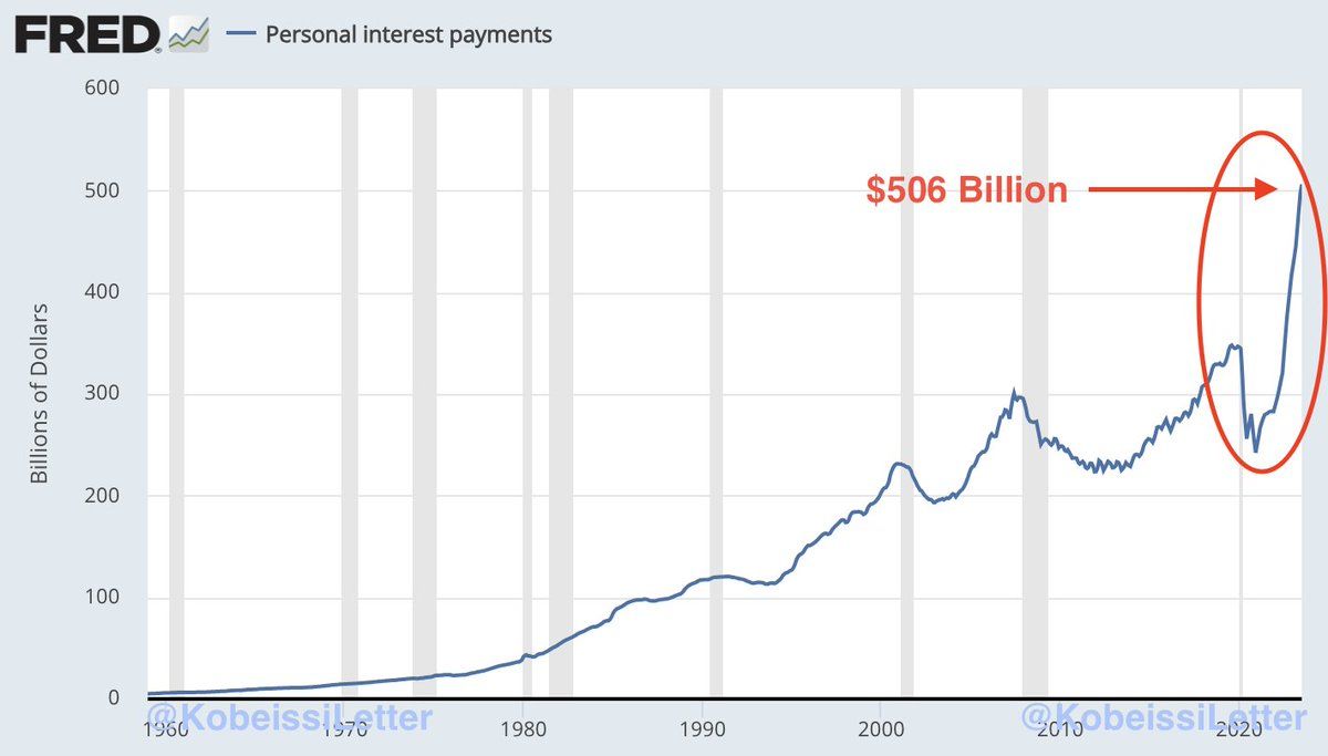 According to the St. Louis Federal Reserve, US personal interest payments hit a record $506 billion in July.Â