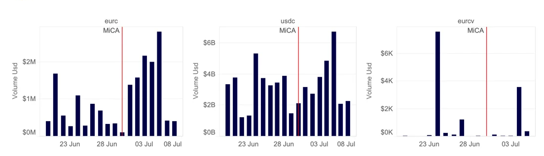 According to the report, USDC and its sister, the Euro-denominated EURC stablecoin, have witnessed the strongest daily trading volume since June 30, when the first part of the MiCA framework went into effect in the European Union.