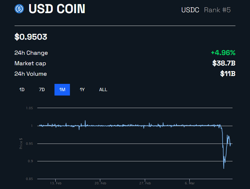 According to BeInCrypto data, USDC almost regained its $1 peg following Circle’s promise but has retraced to $0.95 as of press time. The stablecoin had lost over $6 billion of its supply on March 11 as investors feared it could crash.
