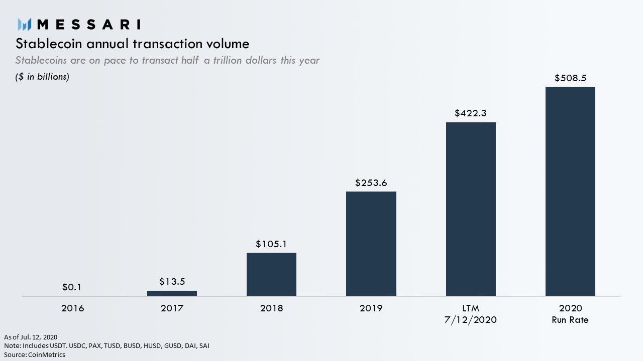 Stablecoins represent a transaction volume of about $508 billion so far in 2020. The fiat alternatives are even catching up with some industry heavyweights. In recent months, stablecoin transactions regularly constituted over 40% of the combined daily settlement value for Bitcoin and Ethereum.