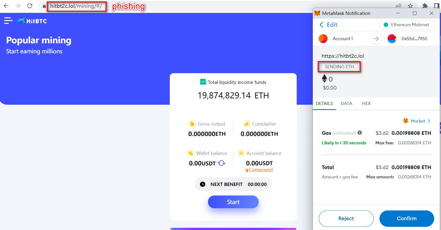 According to the crypto tracking platform MistTrack, hackers created a fake website, “hitb2c[.]lol,” to impersonate the original website, “hitbtc[.]com.”