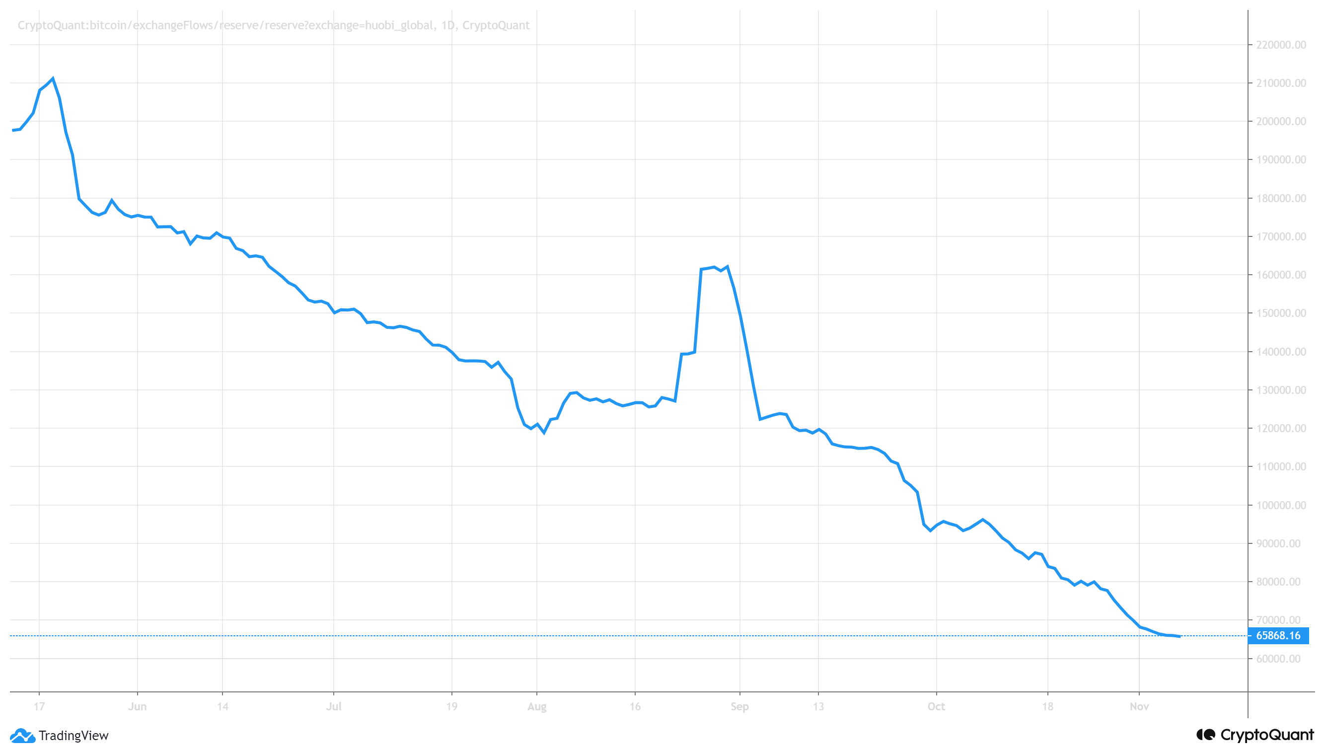 Also, not surprisingly, some exchanges have been impacted more than others by this trend. For instance, Huobi has experienced a major exodus since the crypto crackdown in China forced it to shut down its Beijing offices. Back in August, it held over 160,000 BTC, currently, only 65,000 BTC are left in its wallets. Although some of those bitcoins might have found their way to other exchanges, others may have been moved to personal wallets.