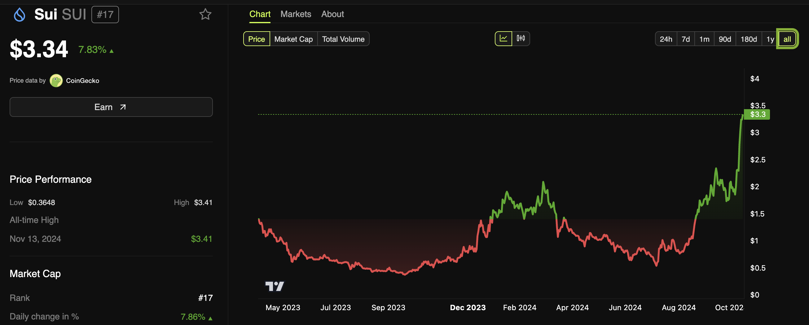 SUI reached this price spike on November 12, one day before the announcement. By the next morning, however, commentators noticed several bearish signals that might indicate a deeper decline. Shortly afterwards, HIPPO, the first SUI meme coin, launched, and this helped propel a continued market interest.