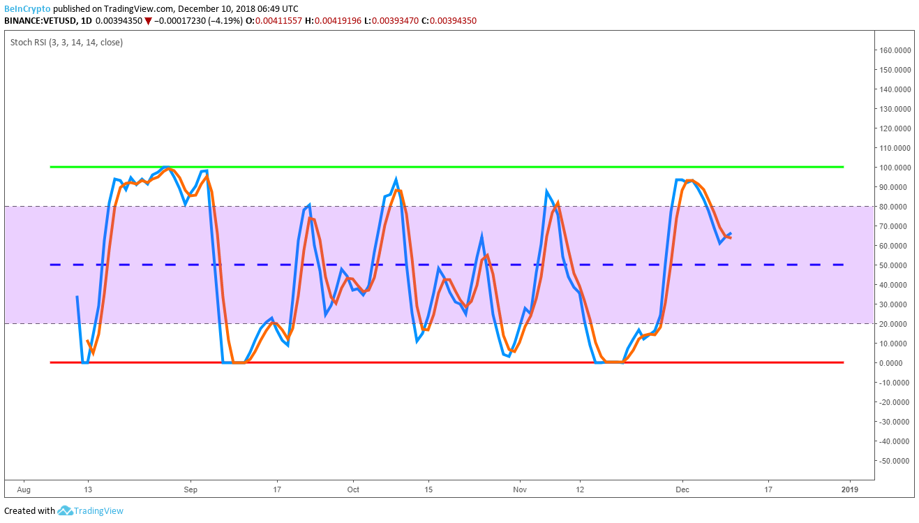 A look over the three-day and two-week stochastic RSI chart shows VET hovering slightly above the midline between 60 and 70.