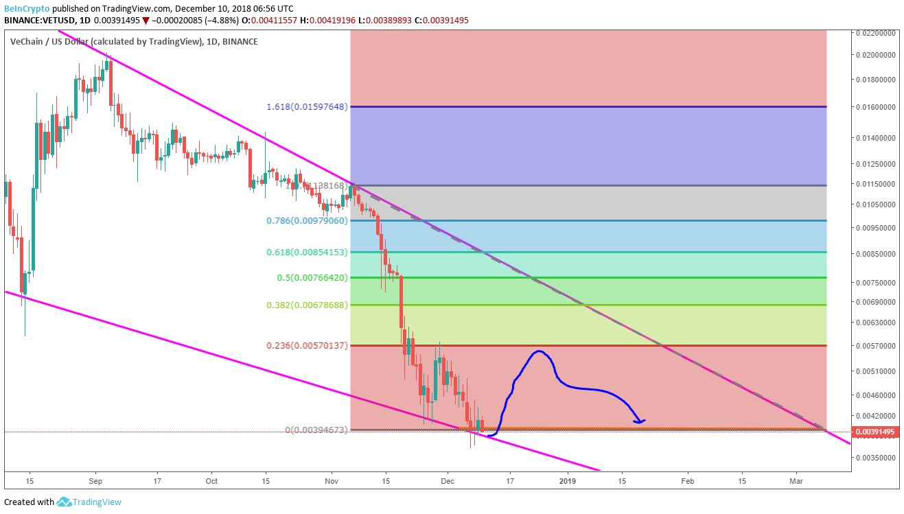 The daily chart below shows the resistance line was tested at the beginning of November which led to a 66 percent dump back down to the support at $0.004. A solid bounce could send VET aiming first for the 0.236 Fibonacci level at $0.0057.