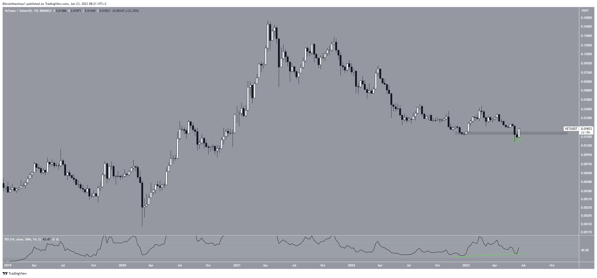 The weekly time frame outlook shows that the VET price has fallen considerably since its all-time high of $0.278 in April 2022. Two weeks ago, the drop culminated with a new yearly low of $0.021.