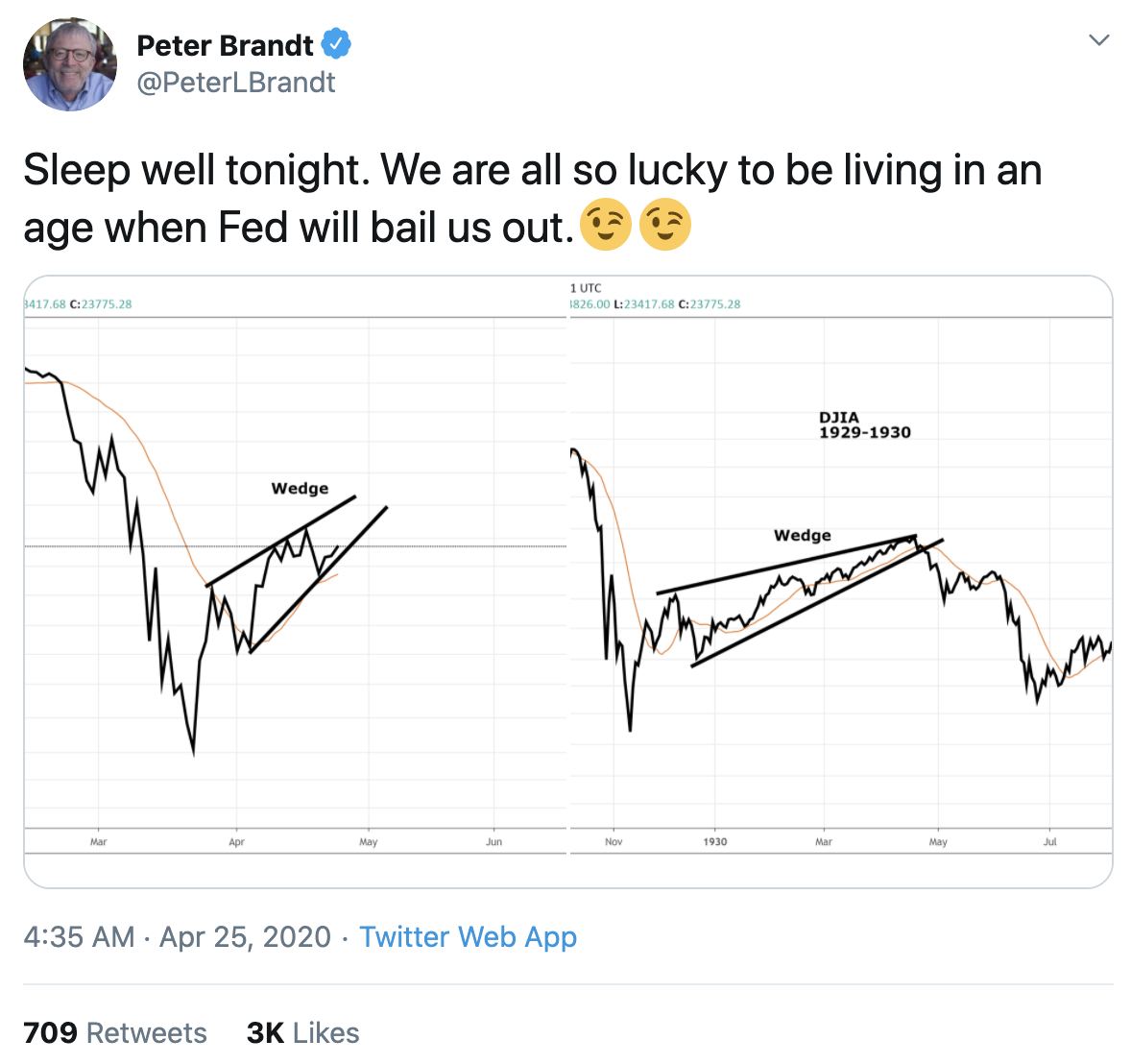The rising wedge is similar to what the Dow Jones posted in 1929-30, Brandt illustrates with a chart. The situation today mirrors the market movements of 1929, in which case we might expect the markets to crash this summer. He compares the markets today and 1929 side-by-side in this recent tweet.