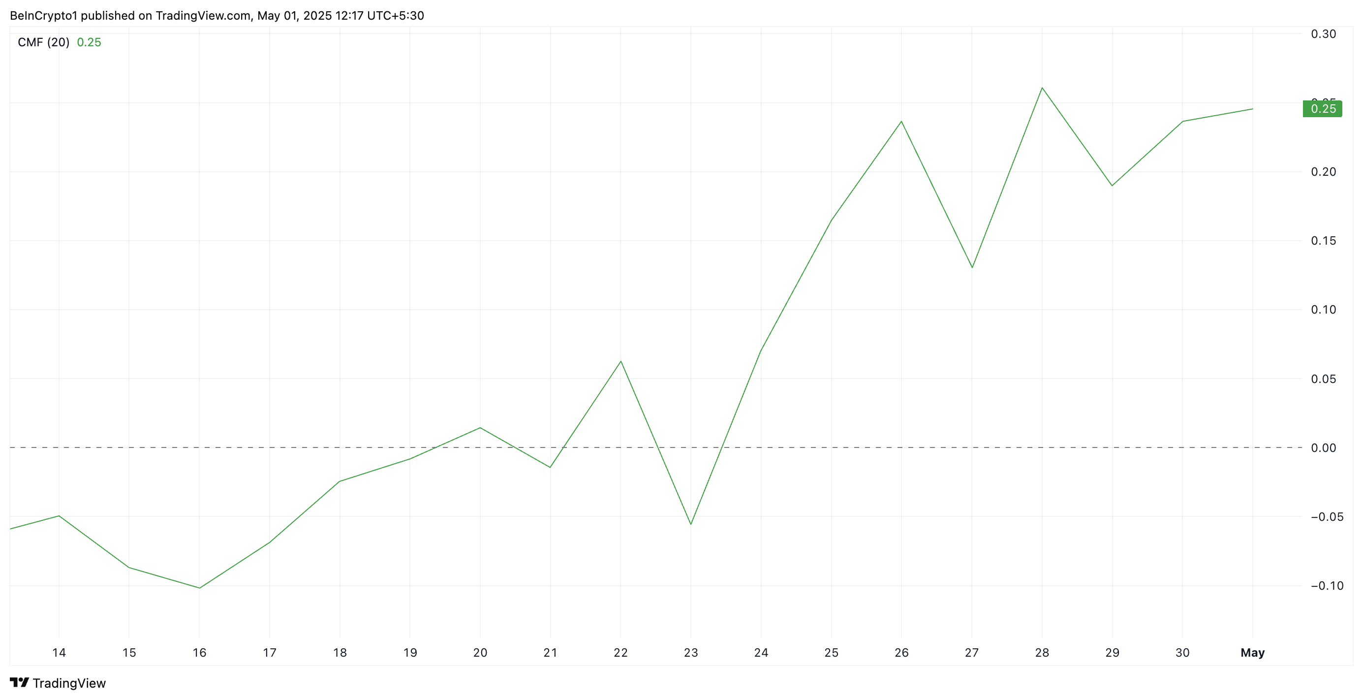SponsoredThe CMF indicator measures money flow into and out of an asset. A rising CMF like this reflects increased capital inflows and positive sentiment among traders.