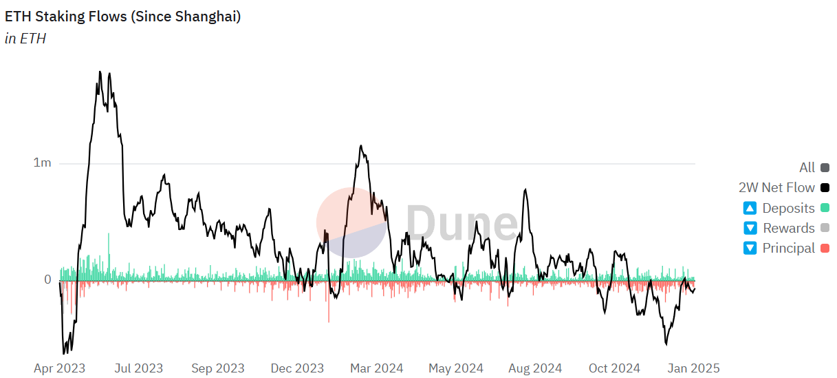 Unfortunately, Ethereum staking rewards have been declining in recent months. However, that’s not the only issue; ETH’s market share hit a 4-year low in mid-January, and it continues to underperform in the bull market due to reduced demand.